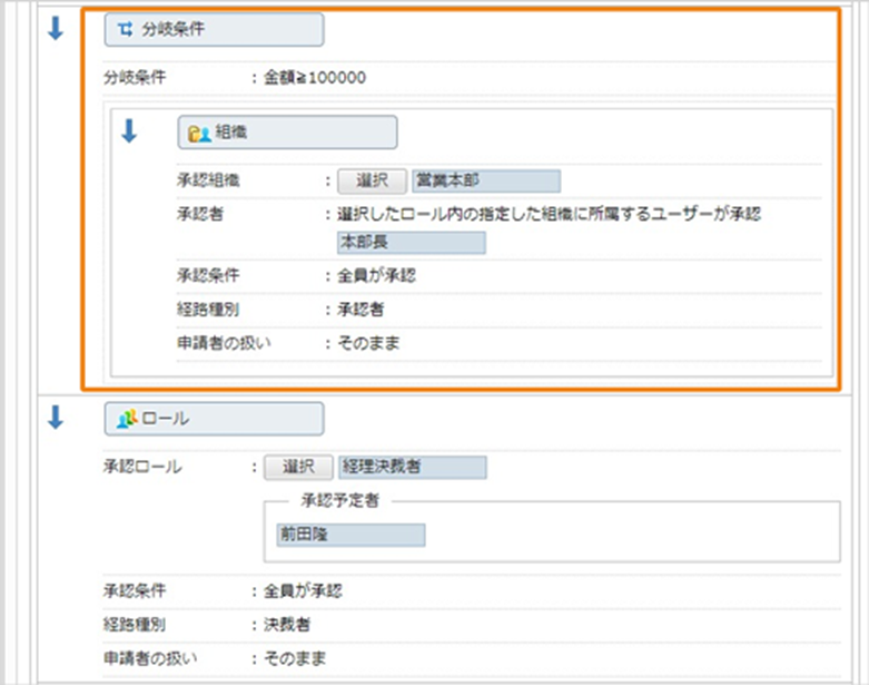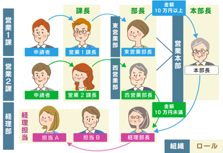 金額等に応じた申請経路の分岐や、合議、決済種別の指定が可能です。 「経理担当者」などの役割の指定で、人事異動時の負担を軽減します。