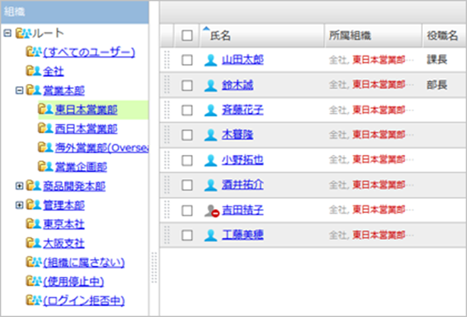 組織情報を階層化して管理可能。異動に伴うユーザーの所属組織の変更も、ドラッグ&ドロップで簡単に行えます。CSVファイルのインポートに対応し、人事・勤怠管理システムやディレクトリサービスのデータを取り込めます。また、誤操作によるデータ損失を防ぐため、ユーザー削除の際は一定期間経過後に削除される仕組み(論理削除)になっています。