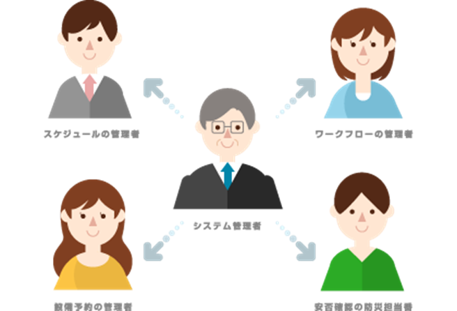 機能ごとに管理権限を委譲でき、「ユーザーや部署のマスタ管理は人事部が担当」といった運用が可能です。複数の部署を管理できるので、事業所ごとに管理を委任することも可能です。