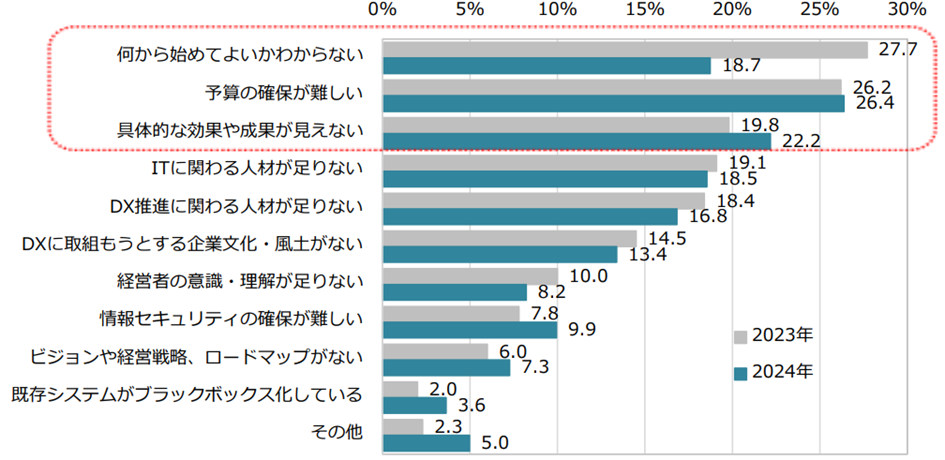 また、従業員20人以下の小規模企業に注目すると、前回よりも「何から始めてよいかわからない」と感じる企業が減り(27.7%→18.7%)、DXへの理解が少しずつ進んでいる様子がうかがえます。